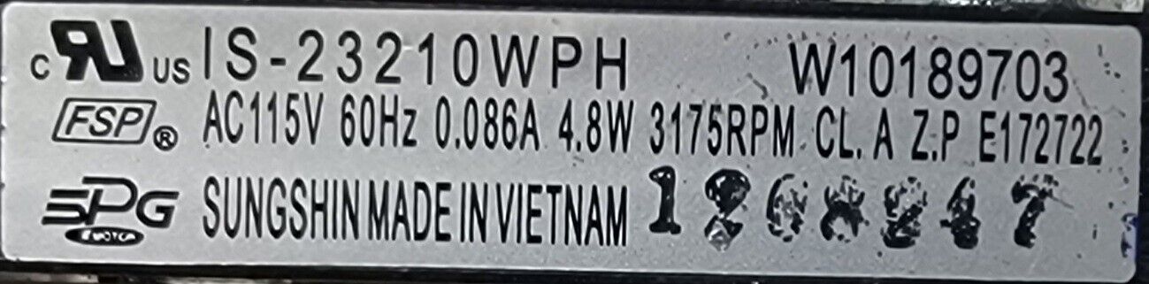 USED Genuine Refrigerator Whirlpool Evaporator Fan Motor Part#W10189703