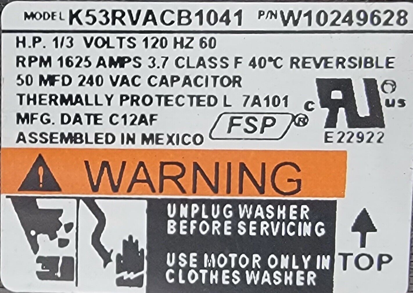 USED Genuine Washer Whirlpool Drive Motor Part#W10249628